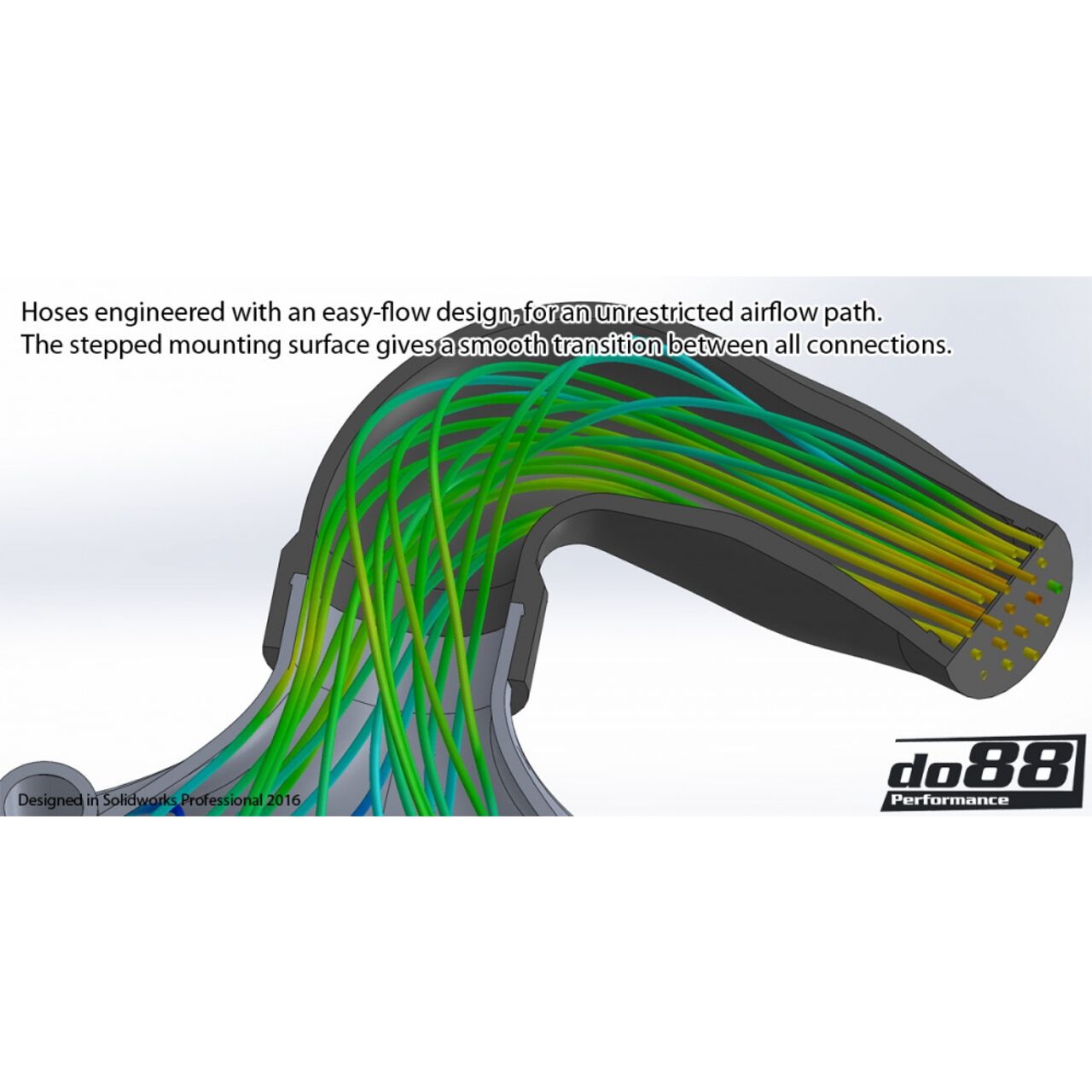 Um die perfekte Passform und Performance zu erzielen, haben wir die Kohlefaserluftleitlamellen mithilfe unseres 3D-Scanners entwickelt. Damit die Luft gleichmäßig verteilt wird und der Druckverlust so gering wie möglich ist, mussten die Schlauchanschlüsse der Tanks umgebaut werden. Die Wahl fiel dabei auf 70 mm Schlauchanschlüsse, was wiederum neue Schläuche in und aus dem Ladeluftkühler forderte. Diese Schläuche sind das Ergebnis eines 3D-Designs mit Durchfluss und Passform als höchste Priorität.