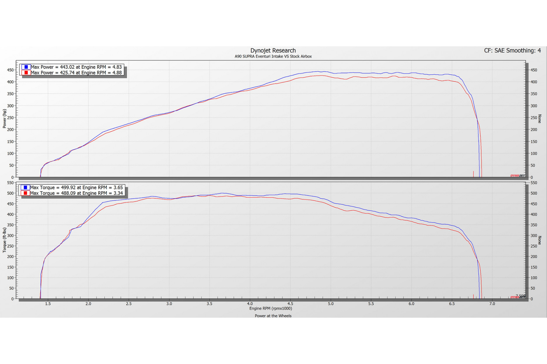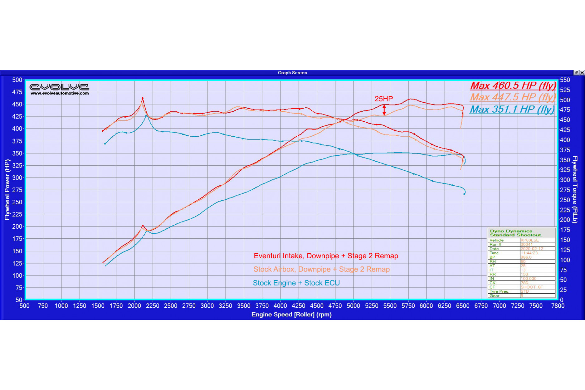 Ein weiterer Prüfstandstest wurde in Großbritannien von Evolve Automotive mit einer Downpipe und einer Stufe 2-Software-Abstimmung durchgeführt. Dieses Prüfstandsdiagramm zeigt den Unterschied zwischen einem vollständig serienmäßigen Supra und dann mit der serienmäßigen Airbox, der Downpipe und der Stufe 2-Abstimmung und schließlich mit dem Eventuri, der Downpipe und der Stufe 2-Abstimmung einen Leistungszuwachs von maximal 25 PS. Alle Läufe wurden mit geschlossener Haube durchgeführt.