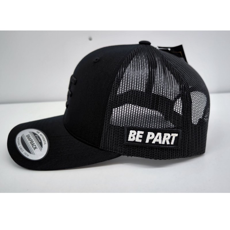 In schwarz mit dezentem schwarzem Stick und „BE PART“ patch an der Seite.