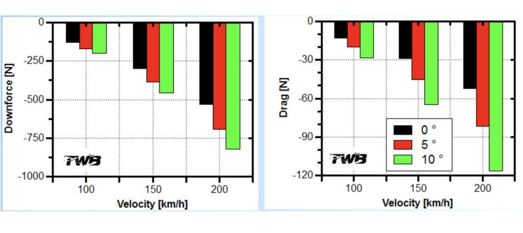 Dieses Schaubild zeigt die Downforce und Drag Werte in Abhängigkeit der Flügelstellung relativ zu der Geschwindigkeit. Dabei ist die Stellung 0° nur ein Basiswert. Die Stellungen 5° und 10° sind Werte, welche man als grobe Richtwerte heranziehen kann.